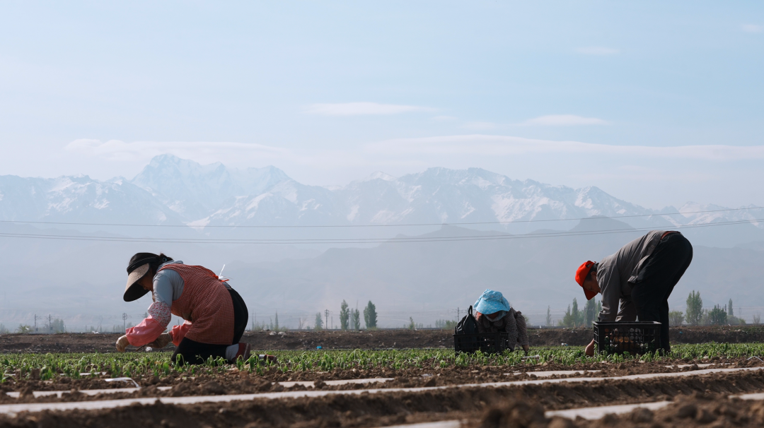 4月16日,在阜康市九运街镇甜叶菊种植基地,农户们分工协作,运苗、打孔、栽苗、稳苗。魏鹏慧 摄
