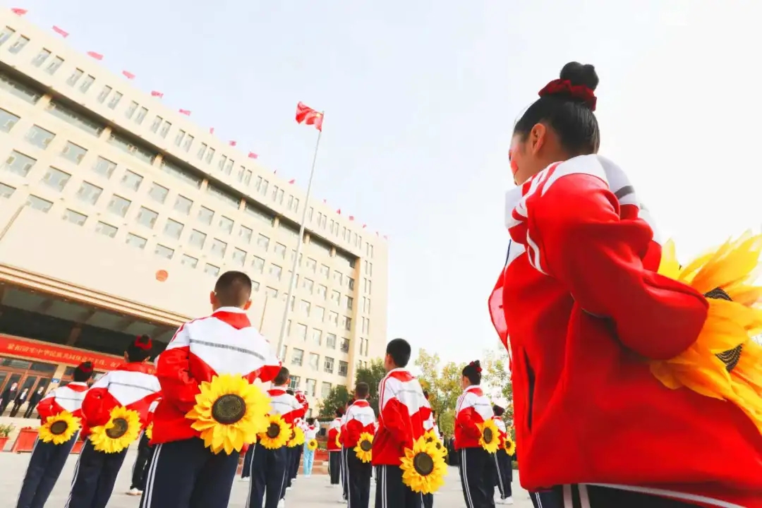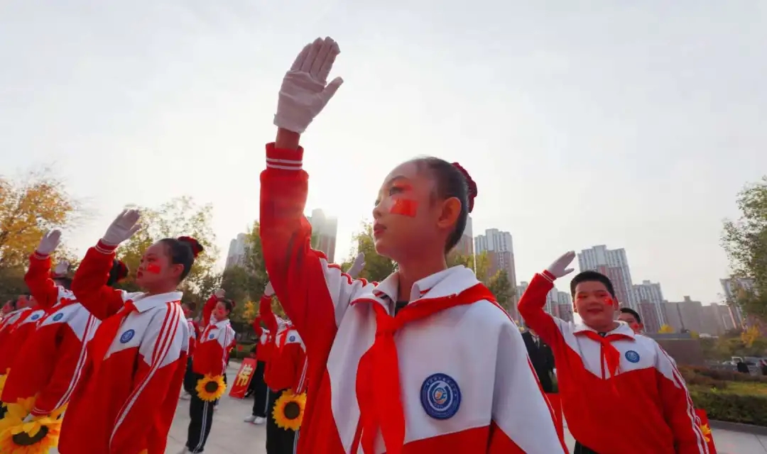升旗仪式上,阜康市晋阜小学少先队员在国旗下献词,为新中国成立76周年送上祝福。