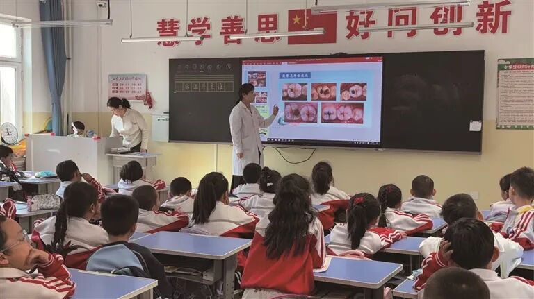 3月19日,阜康市医共体总医院市人民医院院区口腔科医生为阜康市晋阜小学一年级(5)班的学生科普口腔健康知识。张海燕 摄