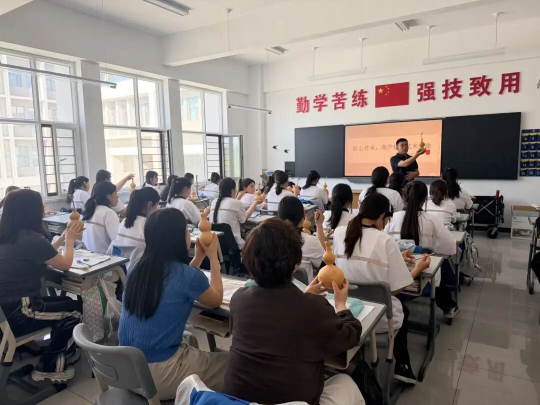 在葫芦烙画体验区,民间艺人王峰详细讲解了葫芦烙画的传承渊源、赏析精品葫芦烙画、细致介绍烙画工具使用方法及基础烙烫技法,随后手持烙笔现场示范如何控制温度与力度,在葫芦表面勾勒纹样、文字。同学们在老师的指导下,先用铅笔勾勒出线条轮廓,再小心翼翼地操作烙笔,焦褐色的纹路在葫芦表面缓缓成型,一件件承载着学生心意的简易烙画作品陆续完成。